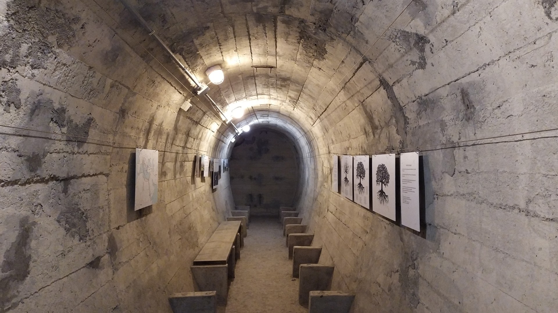 Nella seconda sala, fanno da allestimento delle panche sulle quali il pubblico sperimenta la sensazione della permanenza nei rifugi e la vicinanza con il prossimo, come ai tempi dei bombardamenti.